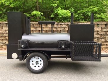 This is our most popular outdoor cooking unit. It comes equipped with a firebox, reverse flow smoker barrel, charcoal grill, and propane burner. This entire unit is built in-house. It has a square tube trailer frame that sits on a 3,500-pound axle. The total length of this unit is 12'9", and weighs 1,100 pounds. The entire unit is painted with a high-temperature paint rated for 1,000 degrees. This unit requires a 2" ball and a standard 4-pole light hook-up.